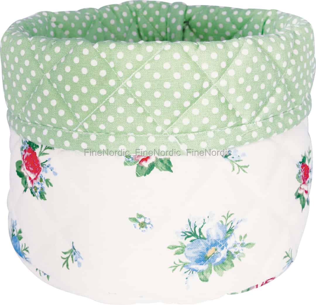 GreenGate har en vidunderlig evne til at indfange essensen af dyrebare øjeblikke, og Alivia White brødkurven er et perfekt eksempel herpå. Designet føles som en side fra en elsket eventyrbog, med fine røde og blå blomster spredt ud over et friskt, hvidt bomuldslærred. Dette tidløse blomstermønster komplementeres smukt af det friske, mintgrønne polkaprikkede interiør, som afsløres i den charmerende ombukkede kant. Det er ikke blot en genstand, der holder på brødet; den holder på løftet om varme, fælles stunder.