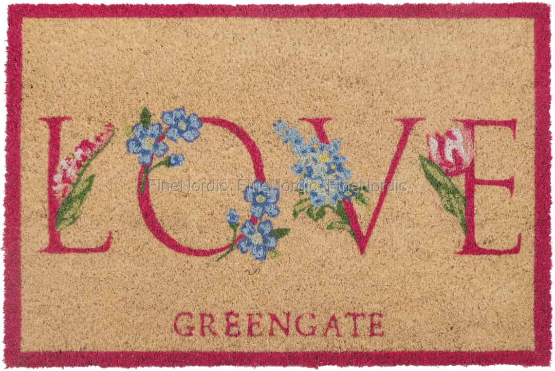Lad det første skridt ind i dit hjem være fyldt med glæde. Denne charmerende dørmåtte fra GreenGate byder enhver gæst velkommen med et budskab om kærlighed, smukt flettet sammen med illustrationer af klassiske haveblomster.