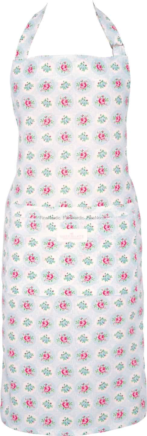Det charmerende mønster, som er et kendetegn for GreenGates designarv, byder på fine lyserøde roser og små blå blomster spredt ud over et lærred af lyseblå og creme. Med sit generøse snit og en praktisk forlomme til dine redskaber eller opskrifter kombinerer dette forklæde tidløs skønhed med praktisk anvendelighed i hverdagen. Det er et stykke design skabt til at skabe minder, til de øjeblikke, der er værd at dele.