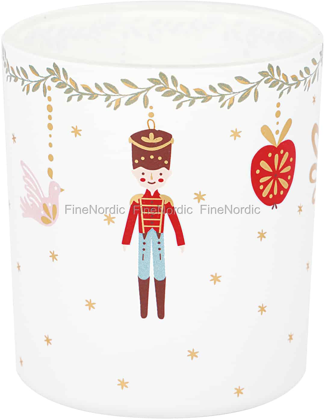 - Et lærred for juleeventyr: Det frostede glas er prydet med charmerende illustrationer i eventyrstil af tinsoldater og festligt pynt, hvilket skaber en herlig fortælling, der folder sig ud rundt om stagen.
