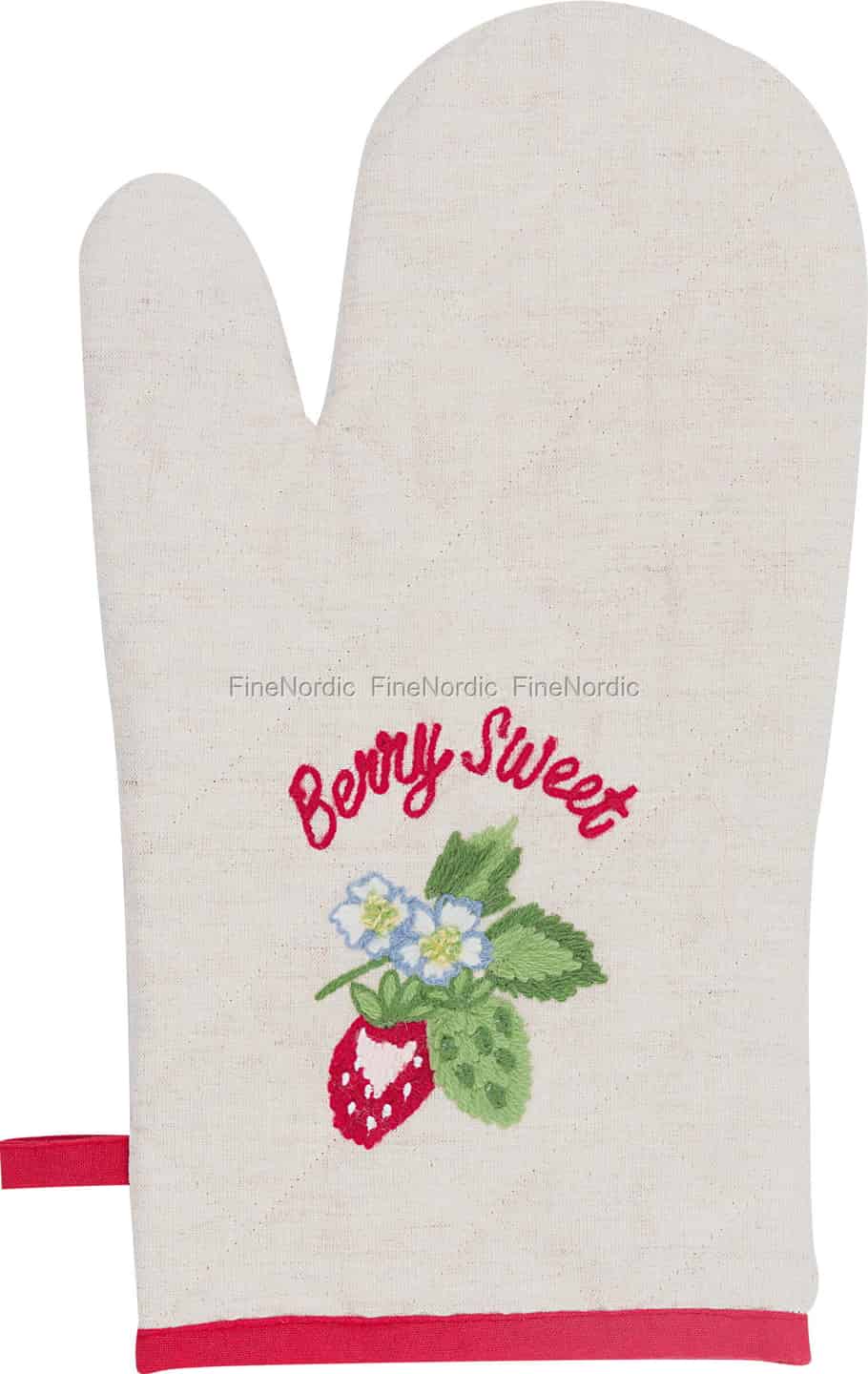 GreenGate indfanger essensen af idylliske sommerdage med Berry Sand-kollektionen. Denne smukke grillhandske er et vidnesbyrd om deres kærlighed til nostalgisk charme, med et sirligt broderi på en baggrund af naturlig, sandfarvet bomuld. Den quiltede tekstur føles betryggende tyk, mens det legende 'Berry Sweet'-budskab og jordbærmotivet vil bringe et smil frem på dine læber, når du tager gyldenbrune scones eller et boblende fad ud af varmen.