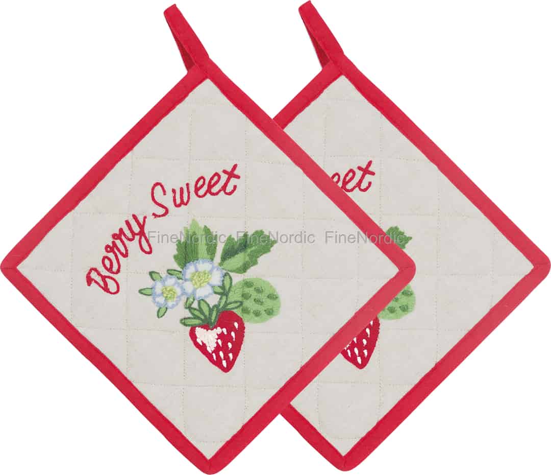 - Charmerende broderede detaljer: Hver grydelap er udsmykket med et yndigt 'Berry Sweet'-broderi, der forestiller et modent jordbær og små blomster, hvilket tilfører et nostalgisk og håndlavet præg til dit køkken.