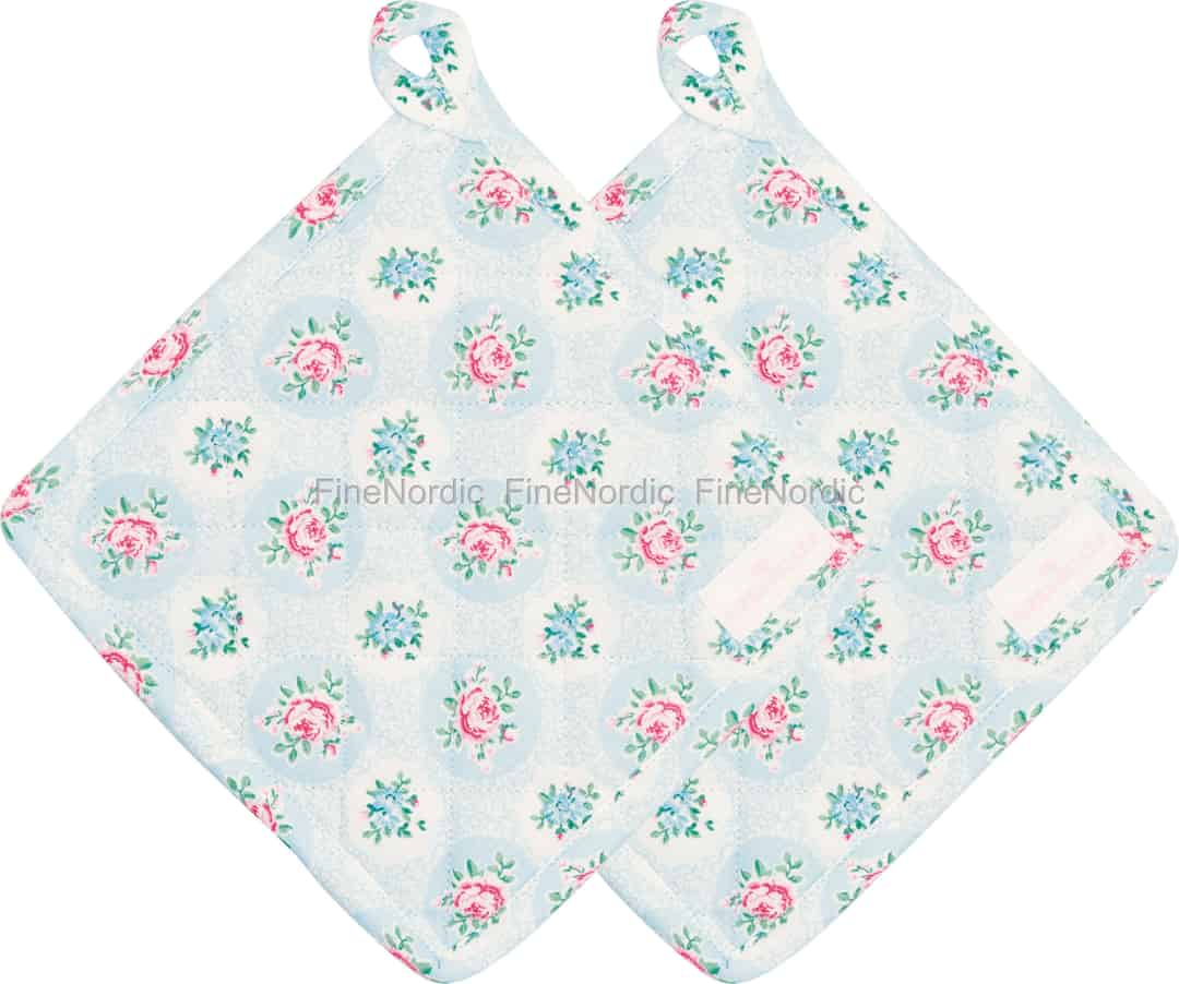 GreenGates Elle Pale Blue-kollektion er en kærlighedserklæring til de enkle glæder ved hjemmebag og 'slow living'. Dette sæt med to grydelapper indfanger den ånd perfekt ved at blande hverdagspraktik med den romantiske nostalgi fra en blomstrende have. Den bløde, quiltede bomuld føles vidunderligt solid i hænderne og danner en blid, men fast barriere mod varmen fra din ovn. Det delikate mønster af lyserøde roser og blå blomster på en rolig, lyseblå baggrund er et kendetegn for GreenGates gennemtænkte design, der sikrer, at selv de mest funktionelle genstande i dit hjem fortæller en historie om skønhed og omhu.