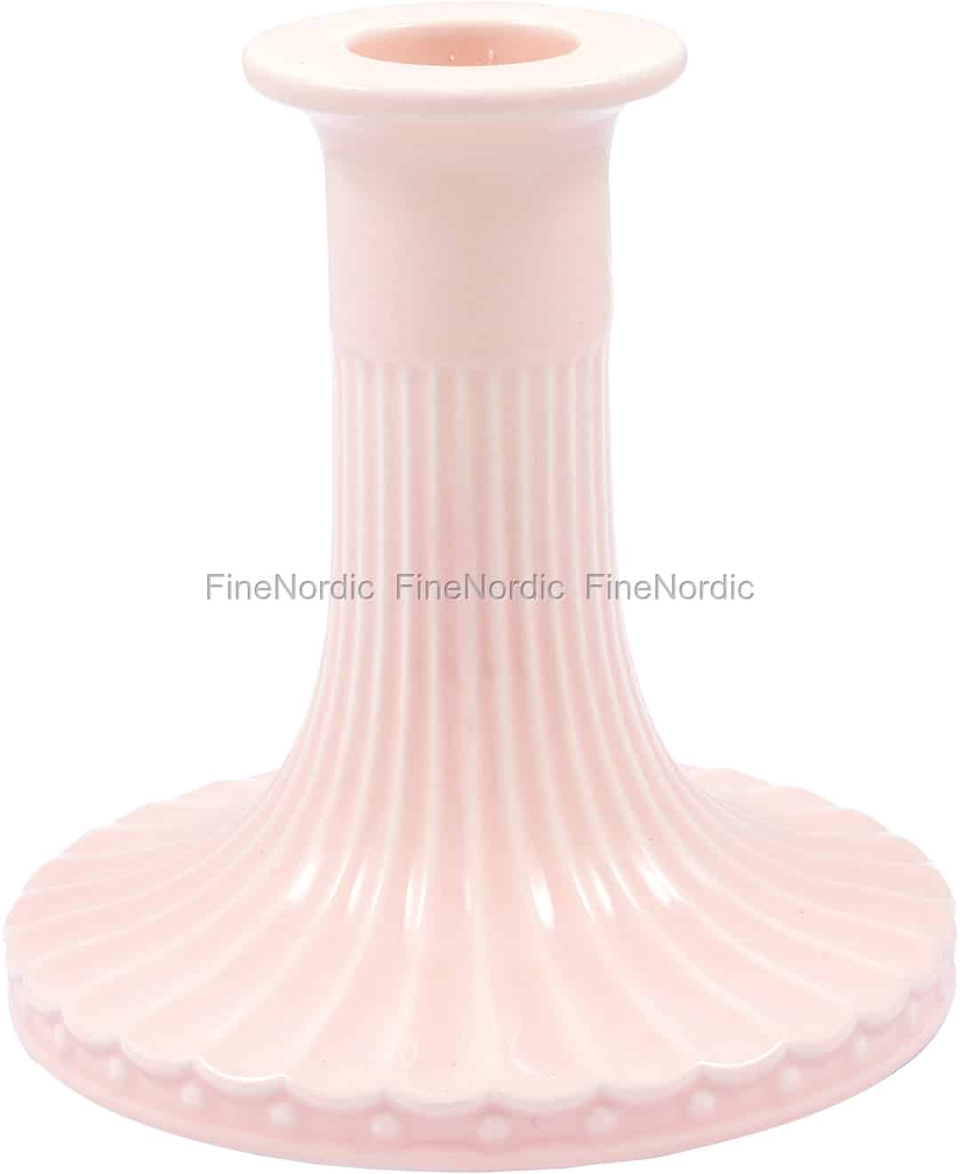 Alice-kollektionen fra GreenGate er en kærlighedserklæring til de enkle, smukke detaljer, der forvandler et hus til et hjem. Denne lysestage, i sin bløde 'pale pink' nuance, er en perfekt legemliggørelse af denne filosofi. Dens klassiske silhuet med yndefulde riller og en charmerende bølget kant føles både velkendt og speciel. Man kan næsten mærke den omhu, der er lagt i designet, fra den blanke finish, der fanger lyset så smukt, til de små perlelignende prikker, der pryder kanten.