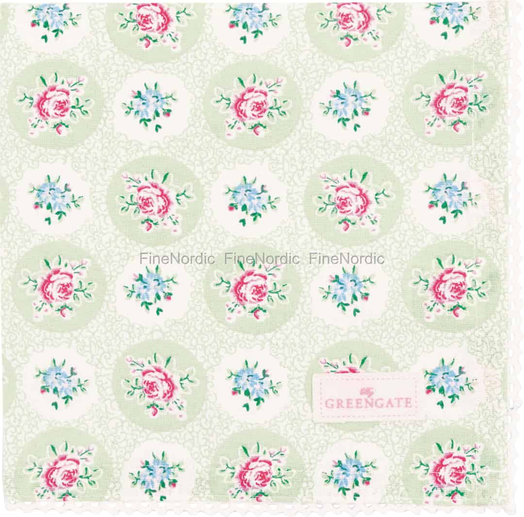 Elle Pale Green-kollektionen fra GreenGate er en kærlighedserklæring til naturens enkle glæder og de dyrebare øjeblikke omkring spisebordet. Hver serviet fortæller en historie om solrige eftermiddage i en frodig have, hvor lyserøde roser og fine blå blomster blomstrer i harmoni. Den bløde, lysegrønne baggrund og det snørklede filigranmønster fremkalder en følelse af ro og nostalgi, der forvandler din spisestue til et fredfyldt fristed. Dette er ikke bare en serviet; det er en invitation til at sætte farten ned og nyde øjeblikket.