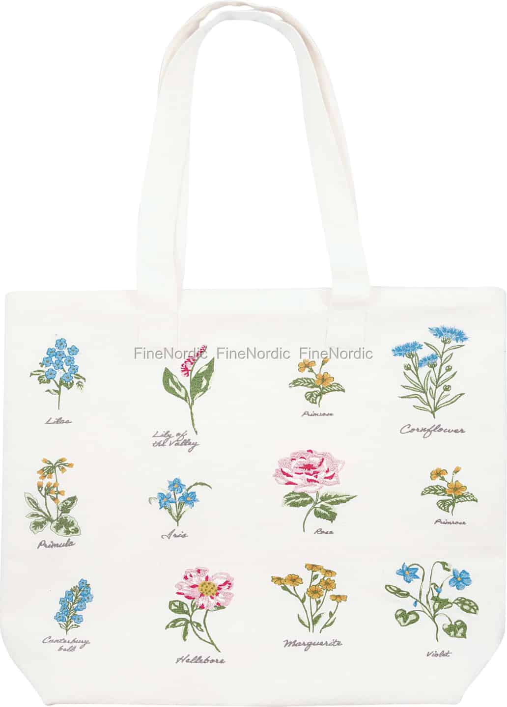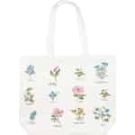 Inspireret af de fine illustrationer fra en gammel botanisk journal er Agnes White-tasken en hyldest til naturens stille skønhed. Hver blomst, fra den ydmyge viol til den glade marguerit, er gengivet med udsøgt broderi, komplet med sit navn i elegant skrift. Det er, som om du har samlet en perfekt buket fra en blomstrende eng, som du kan bære med dig, sæson efter sæson. Det sprøde, hvide bomuldslærred danner den perfekte baggrund, der lader de bløde, levende farver i trådene skinne igennem.