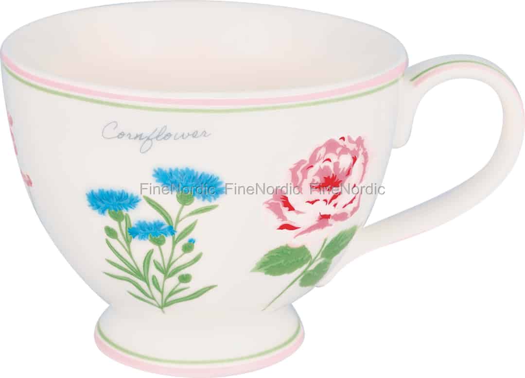 Den er omhyggeligt fremstillet af keramik i høj kvalitet, og dens generøse størrelse og elegante fod får den til at føles både solid og speciel i dine hænder. Det er mere end bare en kop; det er en ledsager til dine stille morgener, et smukt element til din eftermiddagste med venner og en enkel måde at introducere et strejf af blomsterkunst og hygge i din daglige rutine.