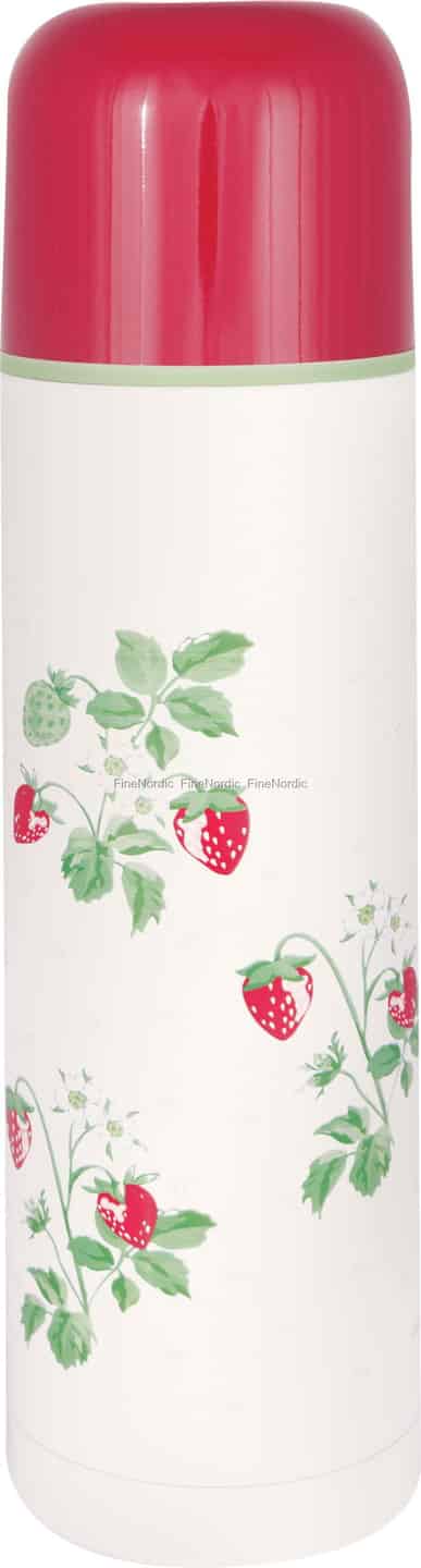 Lad den yndige Berry White termoflaske fra GreenGate føre dig til en solbeskinnet jordbærmark på en perfekt sommerdag. Det smukt detaljerede mønster med modne, røde bær og fine, hvide blomster er et signatur-eksempel på GreenGates evne til at forene nostalgi med tidløst skandinavisk design. Den råhvide baggrund skaber et blødt lærred for det livlige print, mens det blanke, røde låg giver en munter kontrast, der minder om friskplukket frugt. Dette er ikke blot en beholder til din drik; det er et stykke hverdagskunst, der fortæller en historie om de enkle glæder.