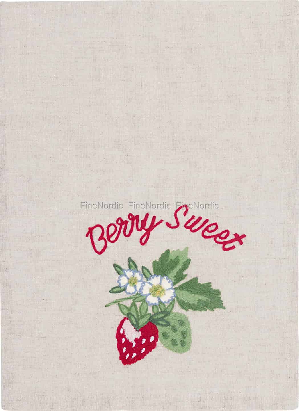 - Udsøgte håndlavede detaljer: Det smukt detaljerede jordbærbroderi med sine livlige farver og skriften "Berry Sweet" tilfører et strejf af legende, nostalgisk karakter til din køkkenindretning.