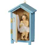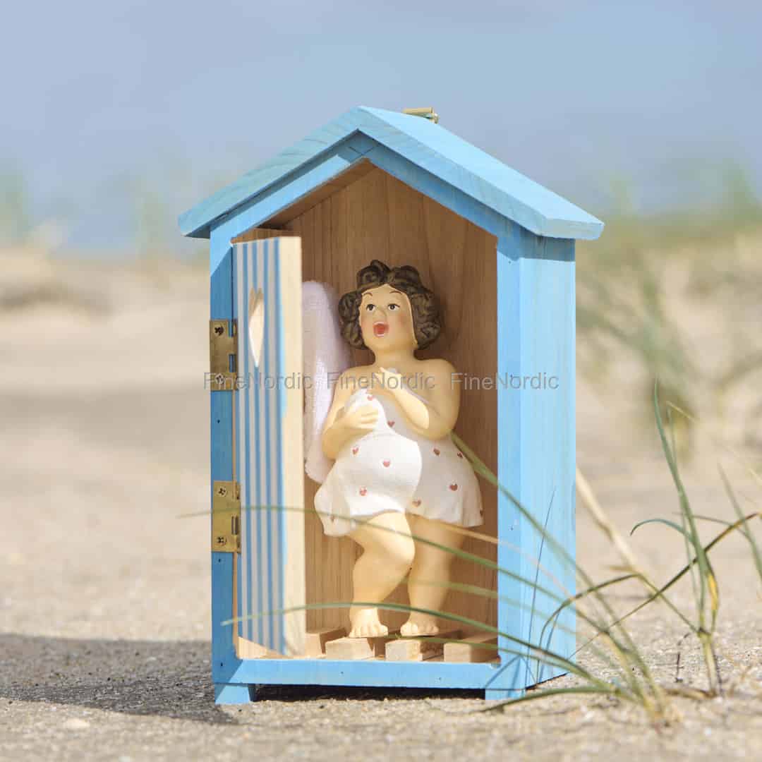 Forestil dig en blid havbrise og den fjerne lyd af måger. Når du kigger ind gennem det hjerteformede vindue i dette klassiske blå og hvide badehus, finder du en charmerende scene, der fanger et øjeblik af glædelig overraskelse. Den yndige dame, svøbt i sit håndklæde, vækker en historie om sorgløse sommerferier og enkle glæder til live. Det er en dejlig, fortællende figur, der vækker nysgerrighed og et varmt smil hos alle, der ser den.