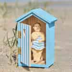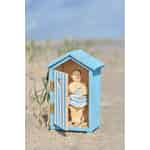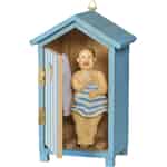 Tag et skridt tilbage i tiden til en klassisk badeferie, hvor lyden af måger fylder luften, og farverige badehuse ligger på række langs stranden. Denne vidunderlige figur fra Ib Laursen indfanger et stille, humoristisk øjeblik fra netop sådan en dag. Når du kigger ind ad den åbne dør i det lille, blå badehus, opdager du en herre, der bliver overrasket, hvilket øjeblikkeligt bringer et smil frem. Det er en hyldest til de enkle, glædelige minder skabt ved havet, fremstillet med den autentiske charme, som Ib Laursen er kendt for.