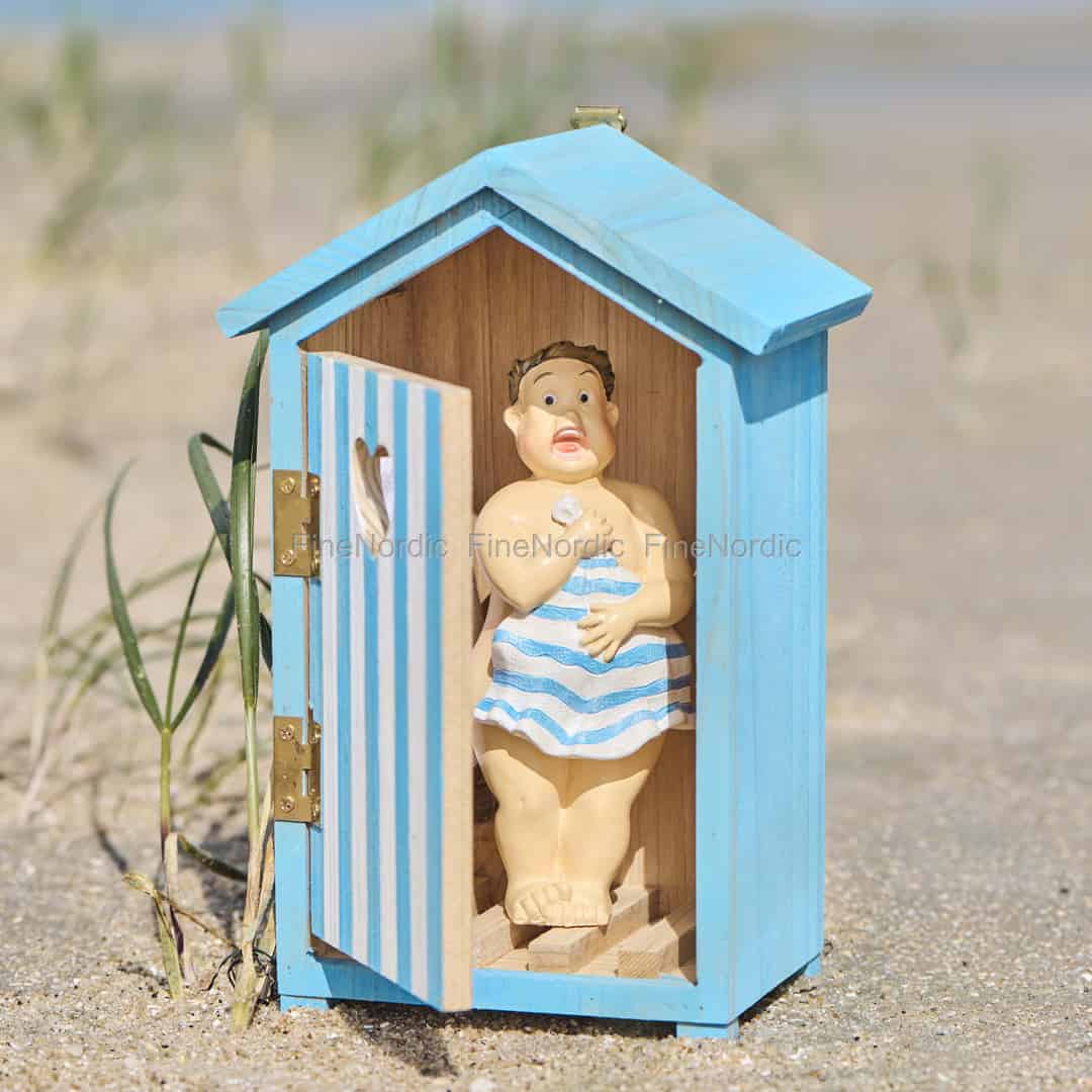 - Et strejf af legende humor: Indeni det klassiske blå badehus tilføjer en komisk herre et dejligt strejf af humor, som gør figuren til en charmerende samtalestarter for dine gæster.