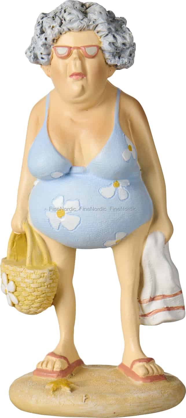 Denne skønne figur er mere end blot dekoration; det er en lille historie, fanget i polyresin. Placer hende, hvor hun kan fange dit blik og bringe et smil frem på dine læber – måske på badeværelset for at skabe en følelse af kystnær idyl, eller på en kaminhylde som en finurlig påmindelse om solrige dage forude. Hun er en hyldest til sommeren, nostalgien og den vedvarende charme ved havet.