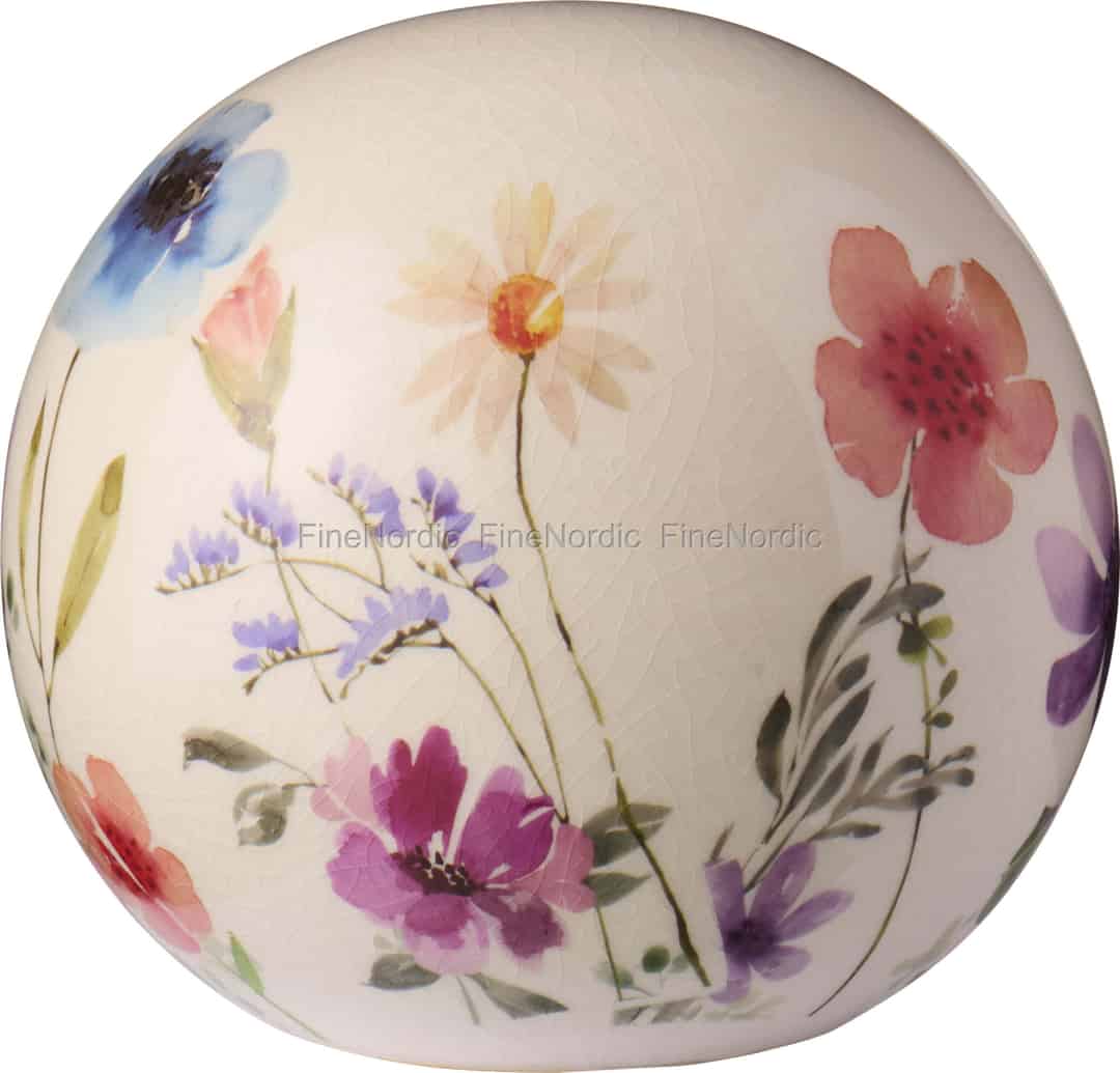 Inspireret af den vilde, utæmmede skønhed i den skandinaviske flora er denne dekorative kugle fra Ib Laursen et lille kunstværk til dit hjem. Keramikoverfladen fungerer som et lærred for et fint udvalg af vilde blomster, malet med de bløde, flydende farver fra akvarel. Valmuer, kornblomster og margeritter blander sig i en blid dans, deres former fanget med en let, udtryksfuld hånd. Hele kuglen er afsluttet med en fin krakeleret glasur, der skaber et net af fine linjer, som antyder den blide patina fra en værdsat antikvitet.