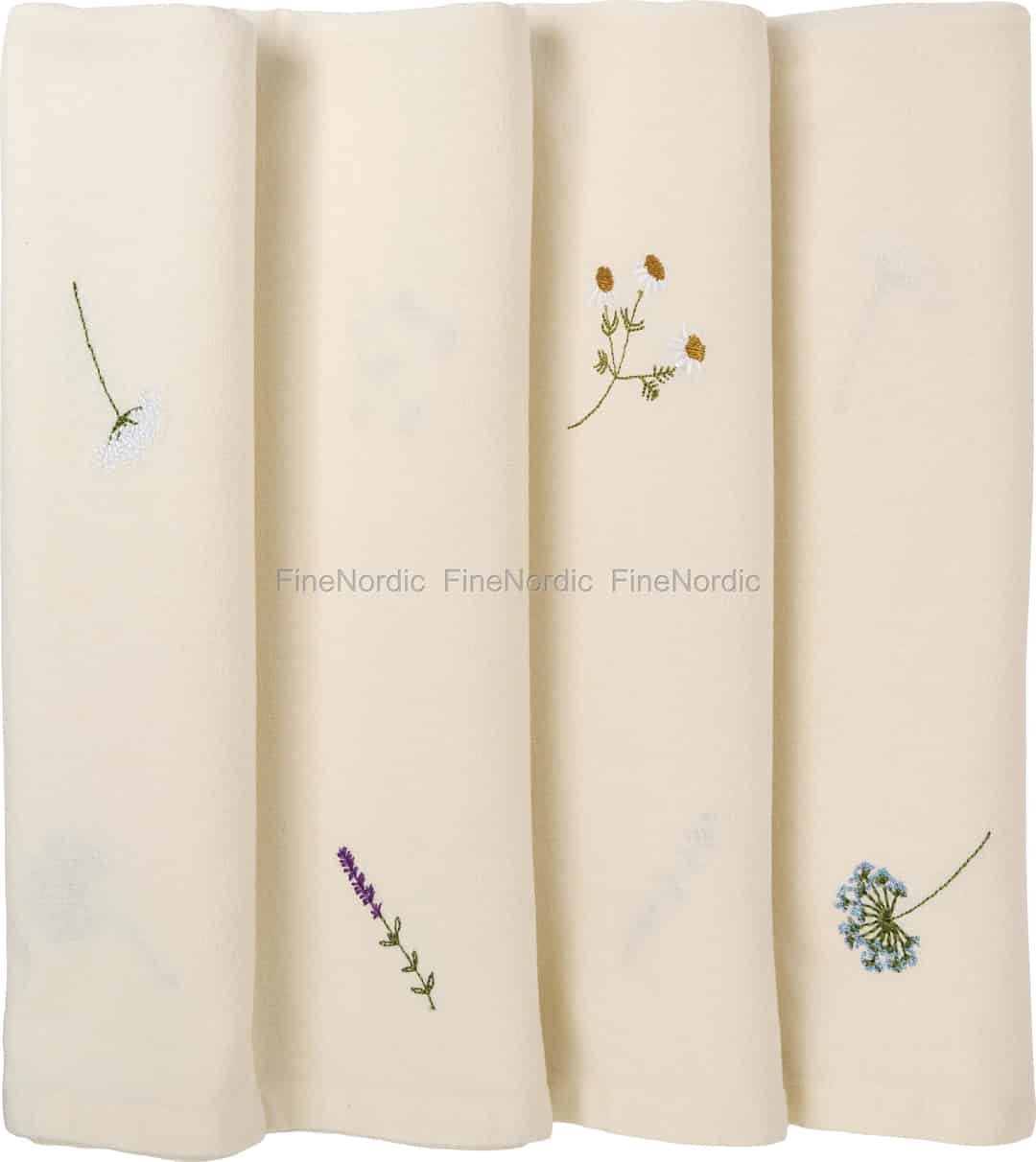 - Udsøgt broderi med vilde blomster: Hver dug er prydet med fire forskellige, fint broderede vilde blomster, herunder lavendel og margueritter, som tilføjer en unik, håndlavet charme til din borddækning.
