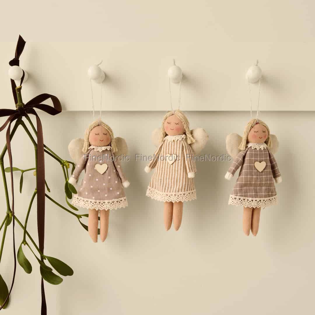 - En trio af unikke personligheder: Du modtager et afstemt sæt med tre engle, hver med en unik kjole i tern, striber eller prikker, som giver dig mulighed for at skabe en harmonisk og varieret dekoration.
