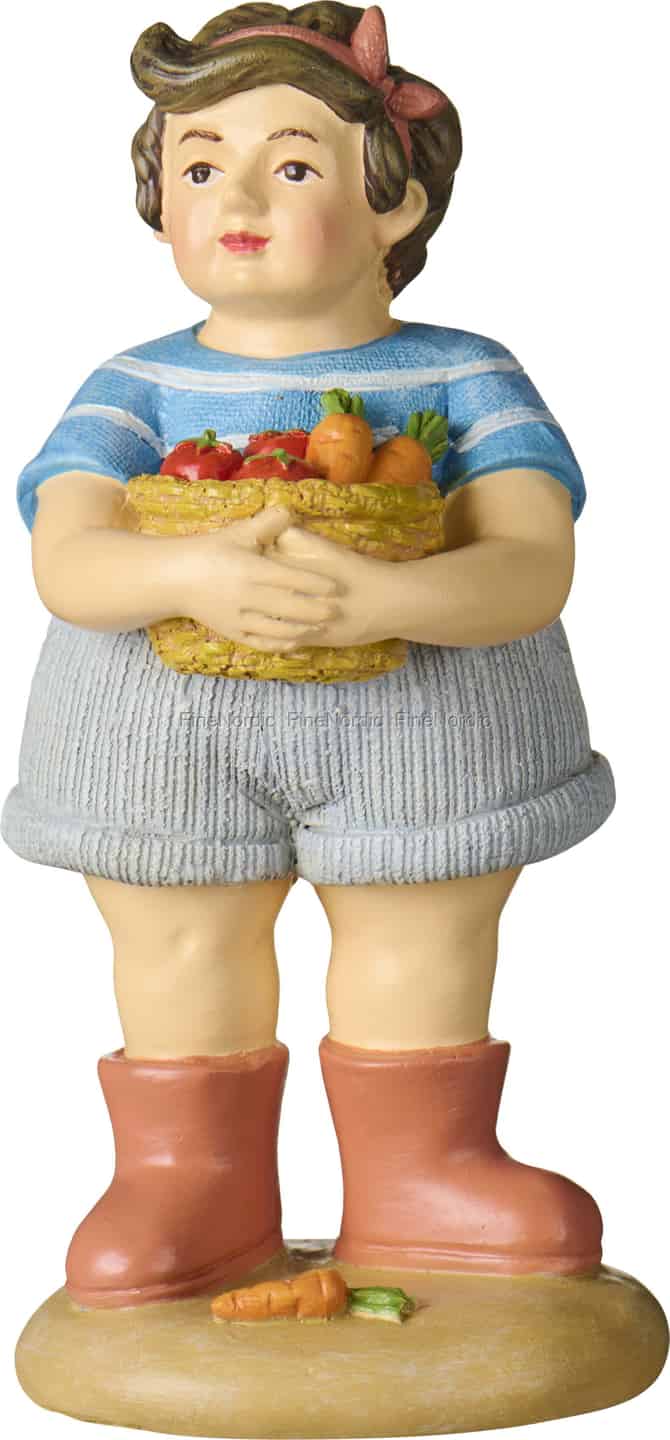 Forestil dig en mild eftermiddag tilbragt mellem grøntsagsbedene, med solen der varmer dine skuldre. Denne kære figur fra Ib Laursen legemliggør den fredfyldte følelse og hylder den sunde glæde ved at samle sin egen høst. Med røde kinder og en kurv holdt tæt ind til sig er denne lille gartner et billede på tilfredshed, der stolt fremviser frugterne af sit arbejde – klare røde tomater og søde, jordnære gulerødder. De vidunderligt teksturerede detaljer, fra den stribede t-shirt til de robuste gummistøvler, giver denne karakter sit helt eget liv og historie.