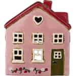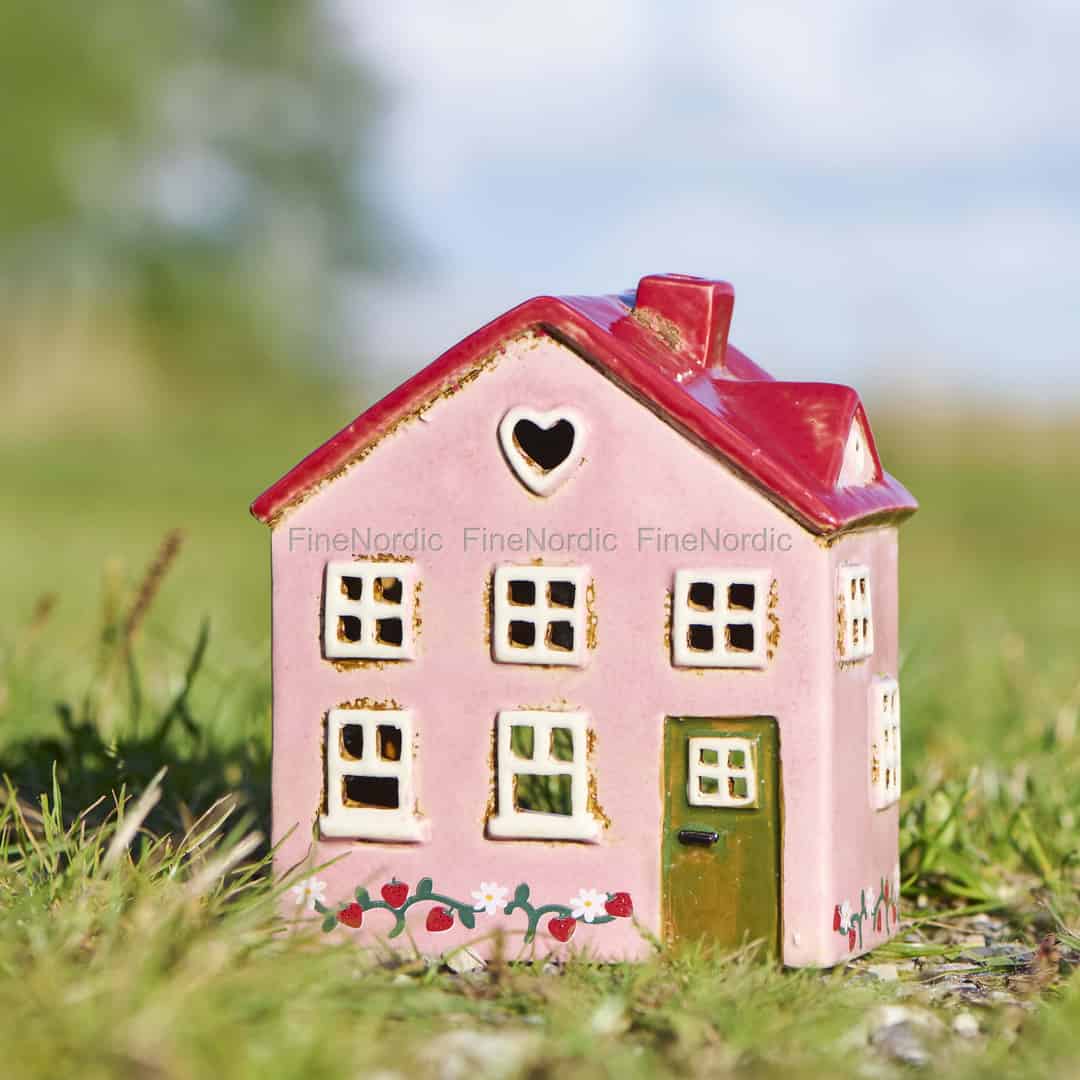 Inspireret af de idylliske sommerhuse i den danske by Ebeltoft er dette smukke fyrfadshus fra Ib Laursen et lille stykke skandinavisk charme. Den bløde, lyserøde facade, det blanke røde tag og den indbydende grønne dør vækker minder om lange, solrige dage og fredfyldte aftener. Hver detalje, fra det hjerteformede vindue i gavlen til den håndmalede jordbærranke ved foden, er designet til at glæde og inspirere en følelse af enkel, rustik lykke.