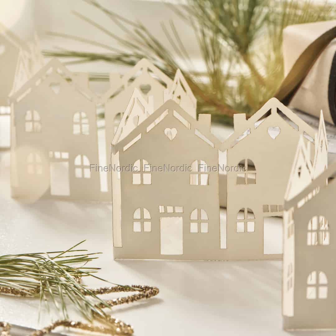 Forestil dig en stille, snedækket gade med charmerende byhuse, lige der på dit festdækkede bord. Denne smukke papirdekoration fra Ib Laursen folder sig ud og skaber en fortryllende miniaturelandsby, der bringer et strejf af skandinavisk enkelhed og magi ind i dit hjem.