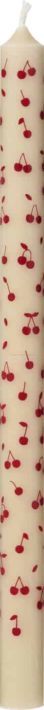 Der findes en særlig form for lykke i de små detaljer, og dette kertelys fra Ib Laursen indfanger netop den følelse perfekt. Den råhvide voks danner et roligt, neutralt lærred for det spredte mønster af klare, røde kirsebær, der vækker minder om sommerens skovture og friskbagte tærter. Det er et design, der tilføjer et muntert glimt i øjet til en ellers fredfyldt og klassisk lysform. Tænd det for at bringe et blidt, varmt skær til din morgenmadskrog eller for at tilføje et strejf af personlighed til en festlig middag.
