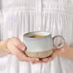 Forestil dig at lade hænderne omslutte dette smukke keramik-krus og mærke den behagelige varme fra din yndlingsdrik. Dets unikke design inviterer til en stille stund og forener en glat, reaktiv glasur med den rustikke tekstur fra uglaseret ler i en sand sanseoplevelse.