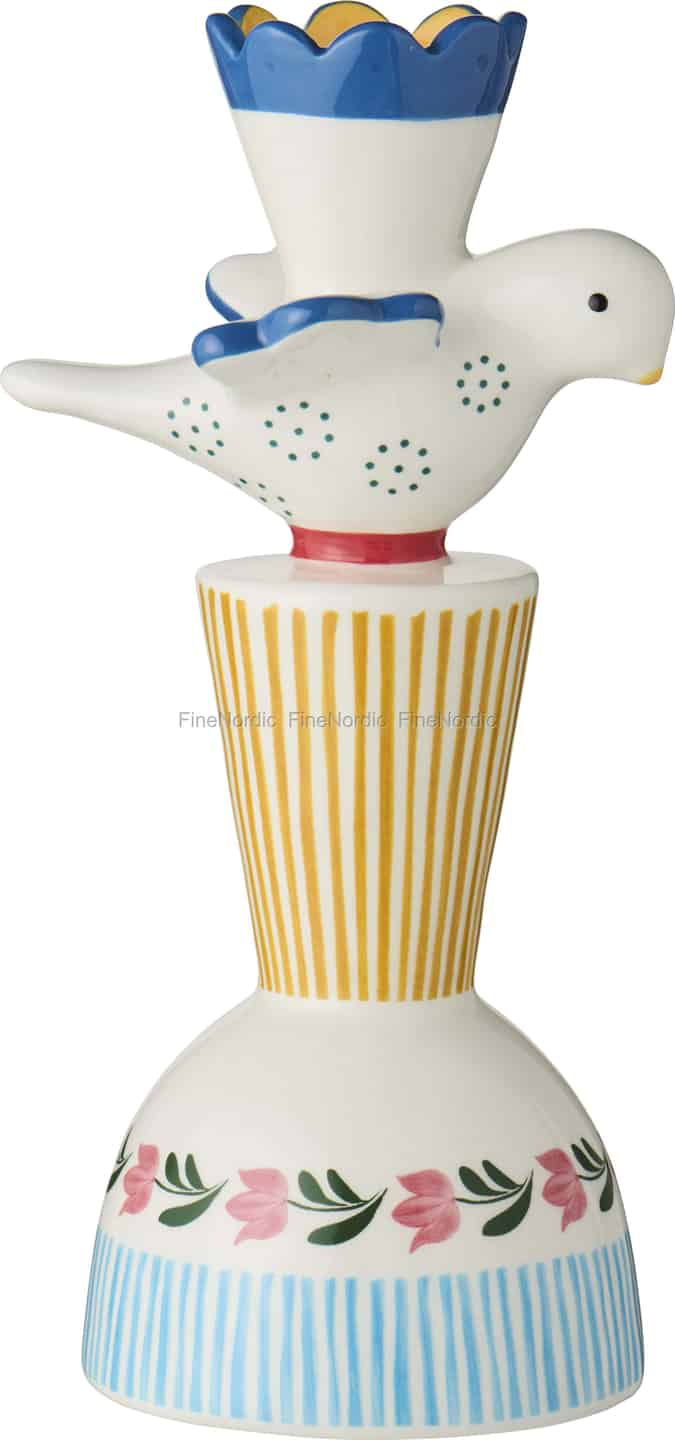 Forestil dig et stykke kunst, der indfanger glæden ved et skandinavisk sommerhus, fyldt med farver, kunst og lys. Denne lysestage fra Ib Laursen er præcis det – en lille skat, der emmer af personlighed. Designet fortæller en historie, fra de himmelblå striber ved foden til de charmerende lyserøde blomster, der omkranser den. I midten sidder en venlig keramikfugl, detaljeret med fine grønne pletter og koboltblå vinger, som synes klar til at dele en munter sang. Det er en hyldest til folkekunsten, hvor hvert penselstrøg bidrager til hele stykkets varme og karakter.
