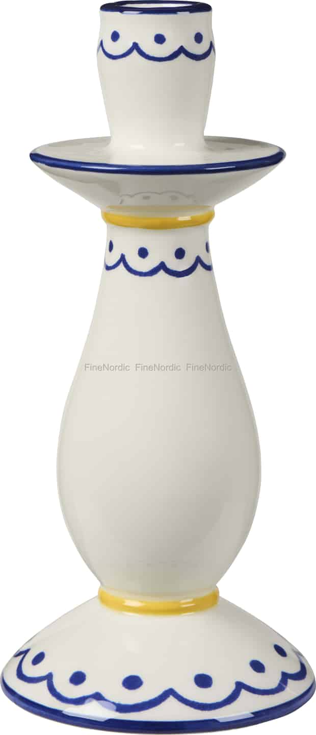 Inspireret af den glade enkelthed i et dansk sommerhus er denne smukke lysestage fra Ib Laursen en lille fejring af farver og håndværk. Den blanke, råhvide keramik danner det perfekte lærred for de dybblå, håndmalede muslingemønstre, der danser rundt om dens fod og kant. Klare, solgule bånd tilføjer en munter kontrast, der fanger lyset og vækker minder om lange, solrige eftermiddage. Man kan mærke omhuen i dens glatte, robuste form – et vidnesbyrd om et gennemtænkt design, der er skabt til at blive værdsat.