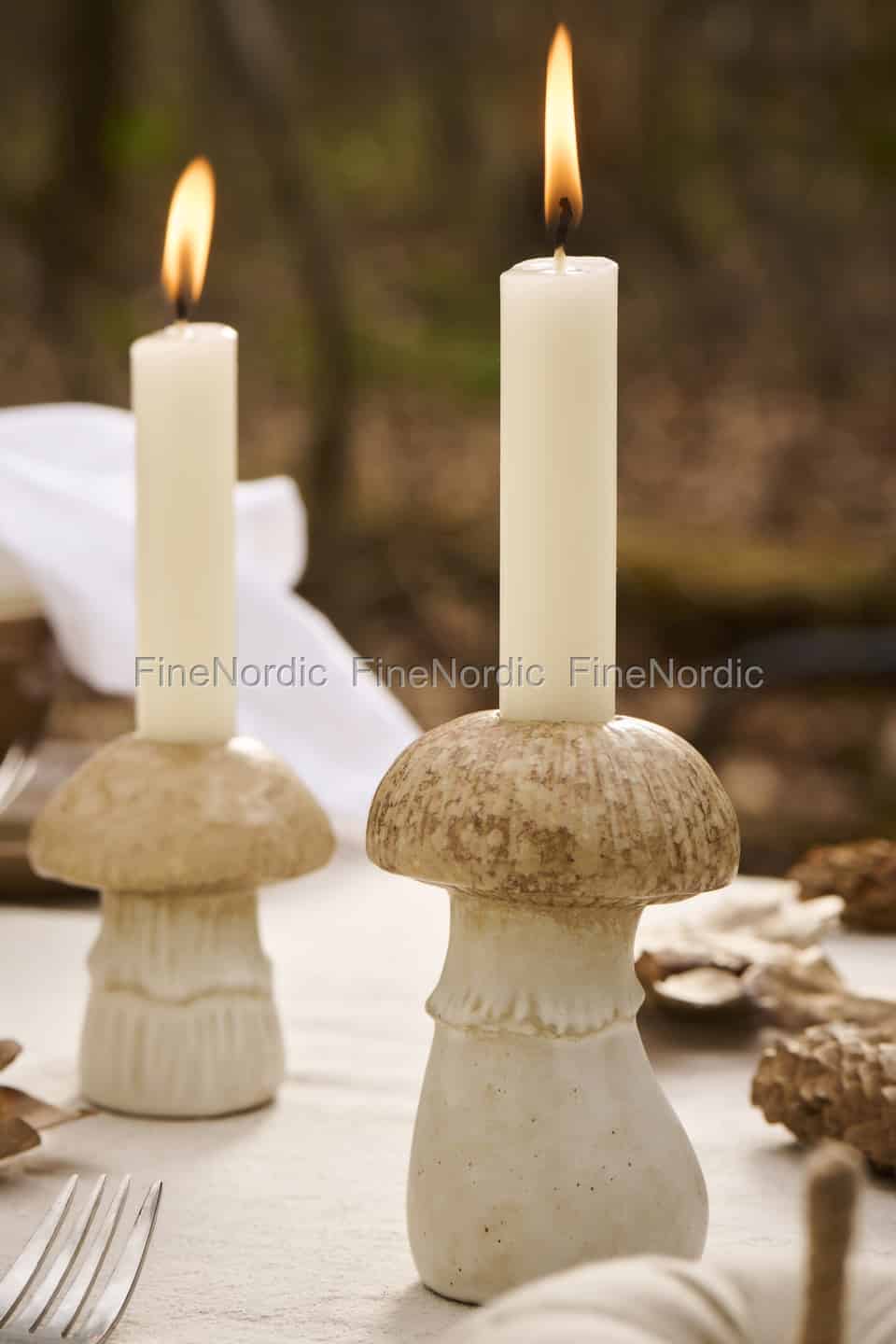 Forestil dig efterårets blide lys, der siler ned gennem trækronerne. Denne smukke lysestage fra Ib Laursen indfanger netop den essens og bringer skovbundens stille charme ind i dit hjem. Hver detalje, fra den rillede, spættede brune hat til den cremede, organiske stilk, er omhyggeligt udført i keramik for at efterligne udseendet af en vild svamp. Den blanke, nistrede glasur fanger lyset på smukkeste vis og tilføjer en diskret glans, der føles både rustik og raffineret. Det er mere end blot en lysestage; det er et lille stykke skovpoesi til dine yndlingsrum.