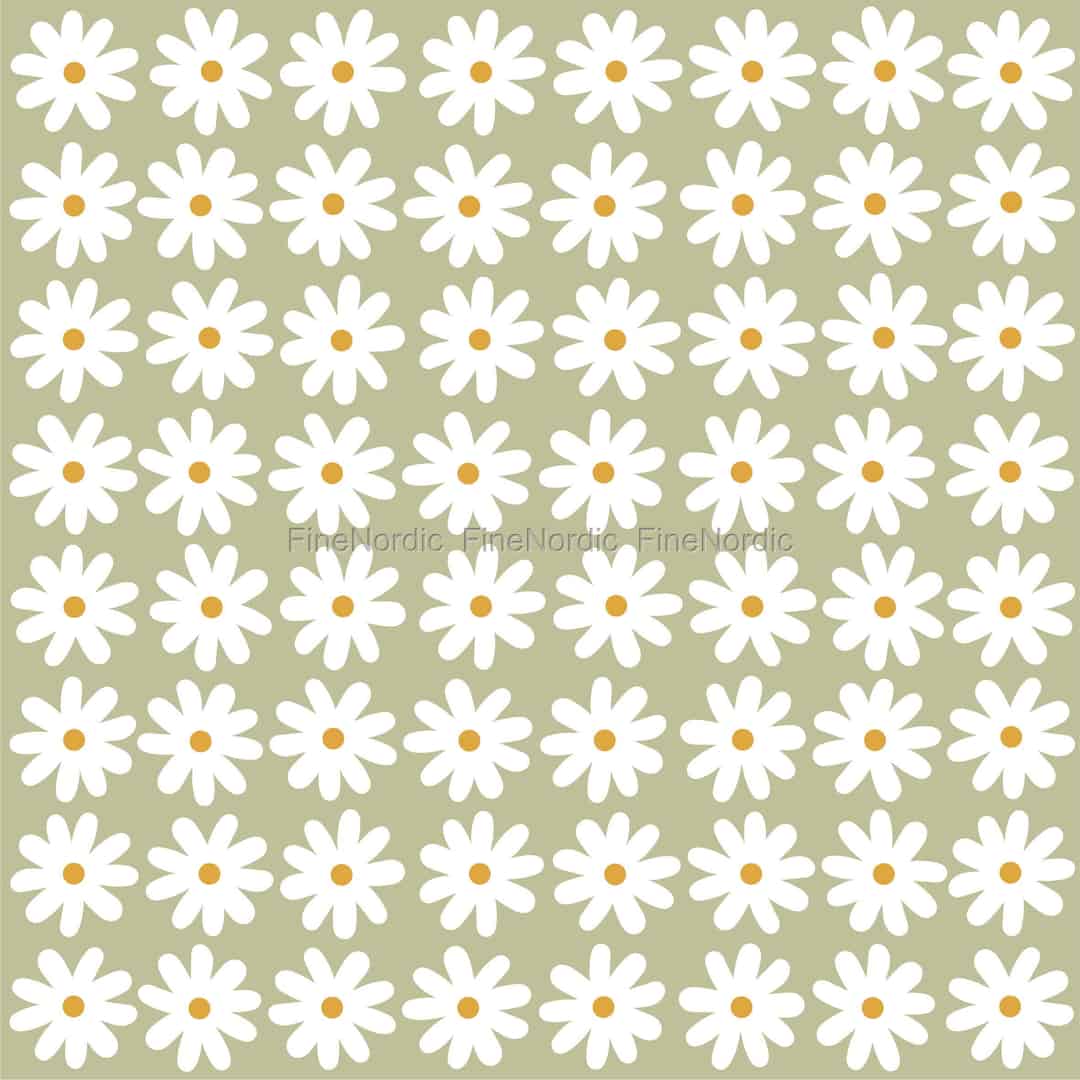 - En glad velkomst med blomster: Det stiliserede print med hvide margueritter på en blød, beige baggrund tilføjer et strejf af finurlig, eng-inspireret charme til ethvert måltid, fra en simpel frokost til en havefest.