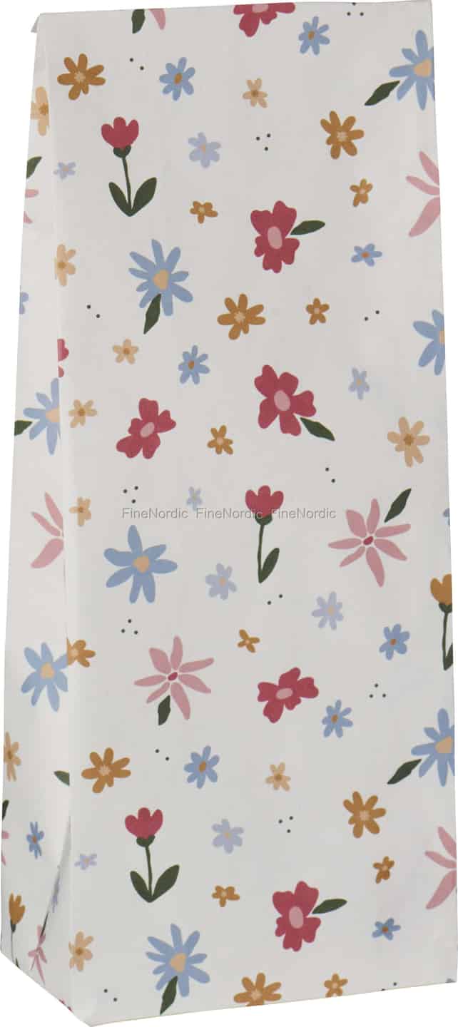 - Et lærred af vilde blomsters charme: Posen er prydet med et yndigt blomstermønster i dæmpede nuancer af blå, rosa og sennepsgul og bringer en skandinavisk blomsterengs blide skønhed til din gavegivning.
