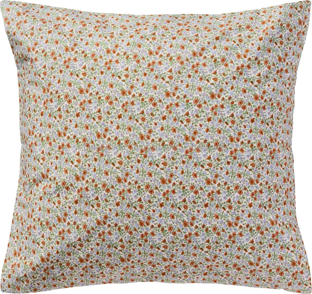 Forestil dig en stille eftermiddag, hvor sollyset strømmer ind ad vinduet, og den blide komfort fra dette yndige pudebetræk. Dets fine blomsterprint med rustfarvede og blå blomster på en cremefarvet baggrund bringer en landlig haves enkle skønhed indenfor.