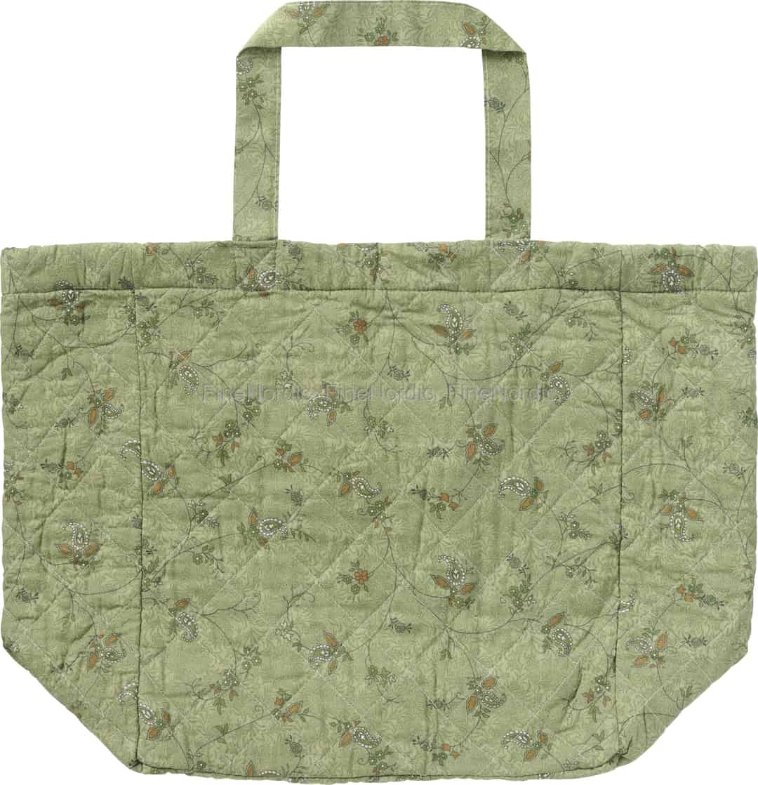 Forestil dig dine daglige fornødenheder puttet trygt i denne smukke, bløde, quiltede bomuldstaske. Dens blide, salviegrønne nuance og fine botaniske print tilføjer et strejf af landlig charme til enhver udflugt, fra markedsbesøg til små ærinder.