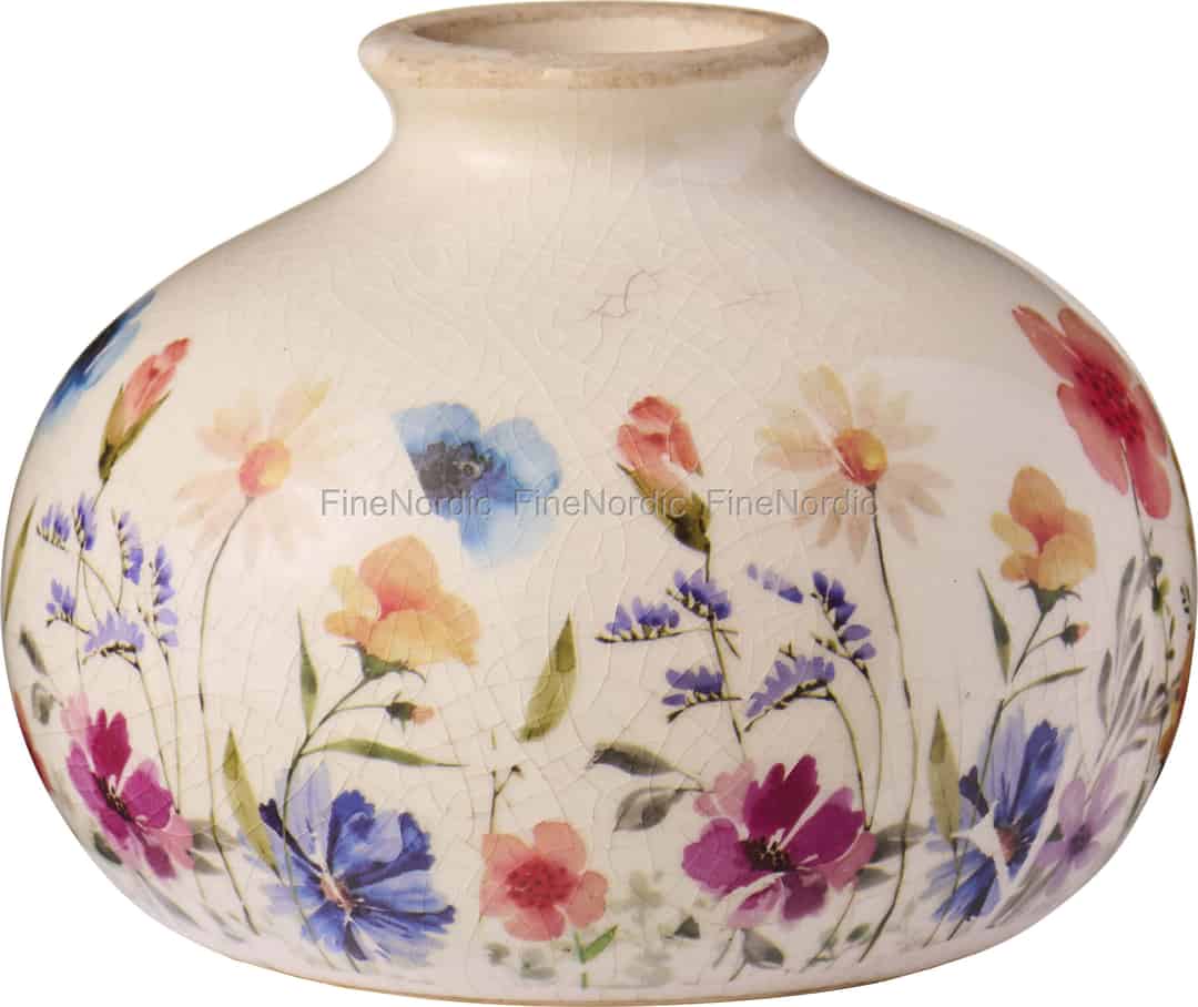 Lad den blide charme fra en solbeskinnet eng blomstre i dit hjem med denne udsøgte vase fra Ib Laursen. Hver enkelt fin blomst, fra de dybblå kornblomster til de sarte lyserøde valmuer, er gengivet i en smuk akvarelstil, der skaber en scene, som føles både levende og fredfyldt. Den afrundede keramikform udgør det perfekte lærred for denne hyldest til naturen, mens den kunstfærdige krakelerede glasur tilføjer et lag af dybde og nostalgisk karakter. Den er mere end blot en beholder til blomster; den er et lille kunstværk, der fortæller en historie om frodige landhaver og stille, enkle øjeblikke.
