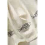 - Fin broderet detalje: En trio af fint syede fisk i en dybblå tråd svømmer langs kanten og tilføjer et diskret, kunstnerisk strejf, der hylder kystens enkle skønhed.