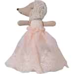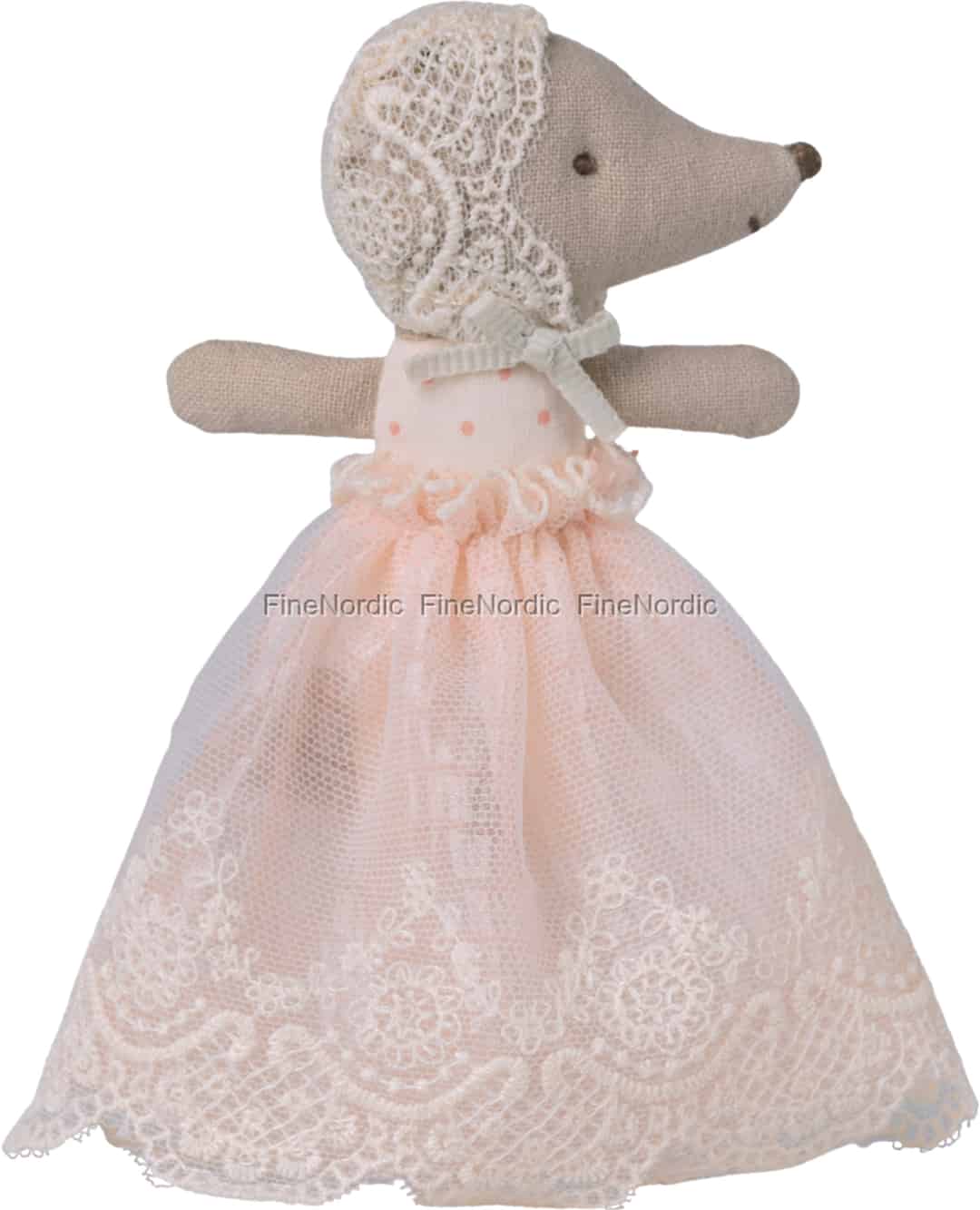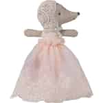 I Mailegs magiske verden har selv de mindste karakterer de største historier at fortælle. Denne søde babymus er et perfekt eksempel med sin bløde stofkrop og sit kære udtryk. Hun ankommer klædt på til en særlig lejlighed i en betagende pudderfarvet kjole med en fin, prikket overdel og et gennemsigtigt skørt prydet med fine blomsterblonder. Hendes blondekyse i vintagestil, bundet pænt med et blødt bånd, indrammer hendes ansigt og gør hende klar til enhver kongelig begivenhed eller hyggestund, du kan forestille dig.