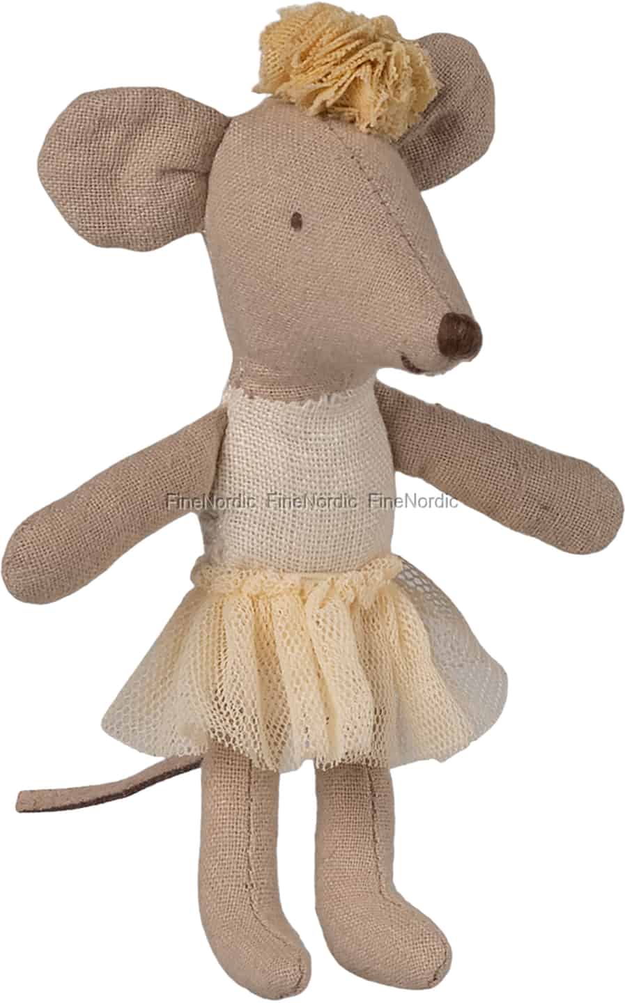 I Mailegs magiske verden kan selv den mindste danser indtage scenen. Denne lillesøster mus er klar til sin debut, klædt i en enkel råhvid gymnastikdragt og et fint cremefarvet tylskørt, der flagrer ved hver en lille bevægelse. Fra hendes broderede øjne, fulde af mild nysgerrighed, til den bløde pompon på toppen af hendes hoved, er hver en detalje designet til at vække fantasien. Hun er en karakter, der venter på en historie; en lille partner til store balletter, der opføres i legeværelsets stille kroge.