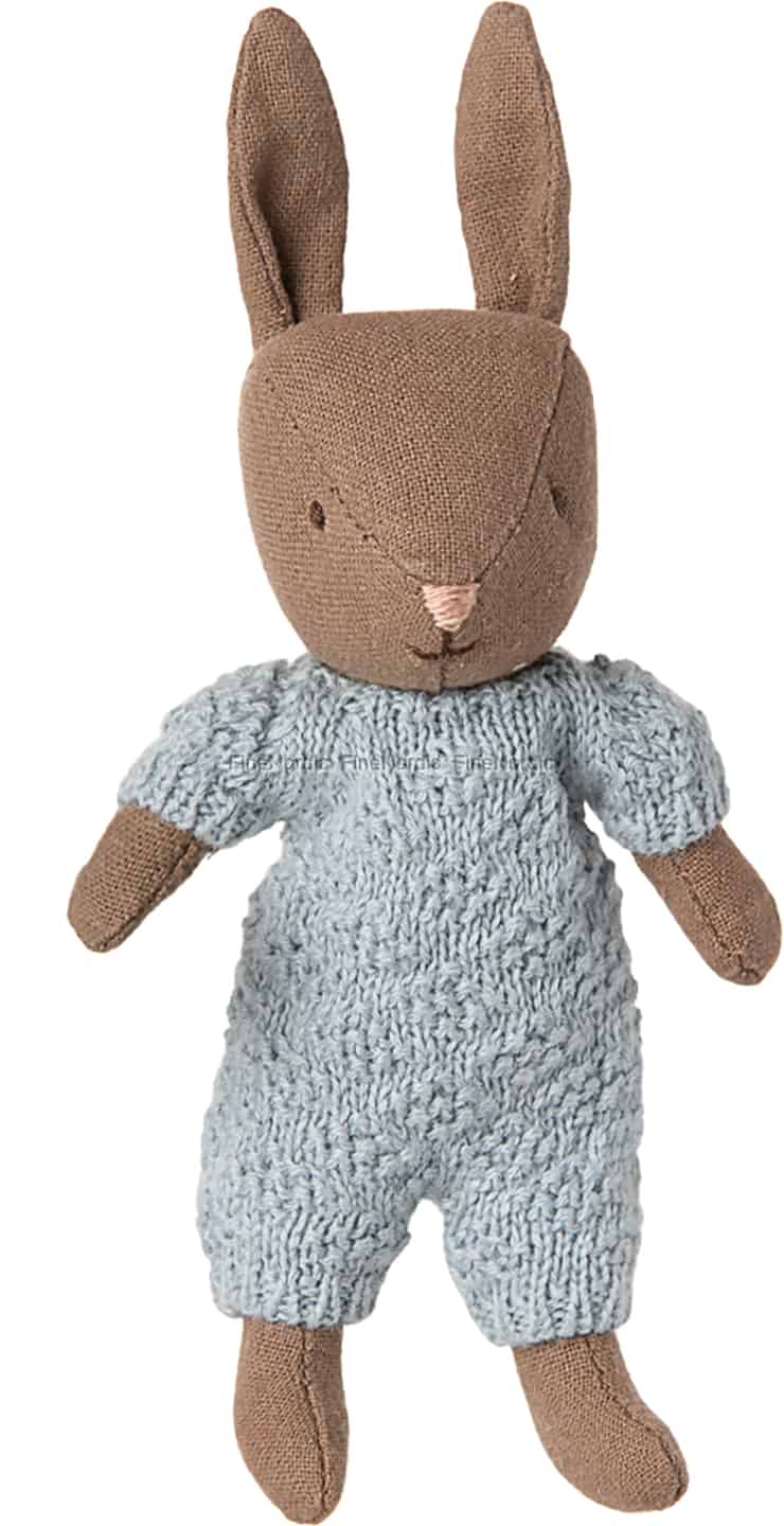 Åbn døren til en verden af vidundere med denne søde micro-kanin fra Maileg. Klædt i en hyggelig, håndstrikket blå dragt er denne lille ven perfekt i størrelsen til små hænder og store fortællinger, klar til at blive en højt elsket følgesvend.