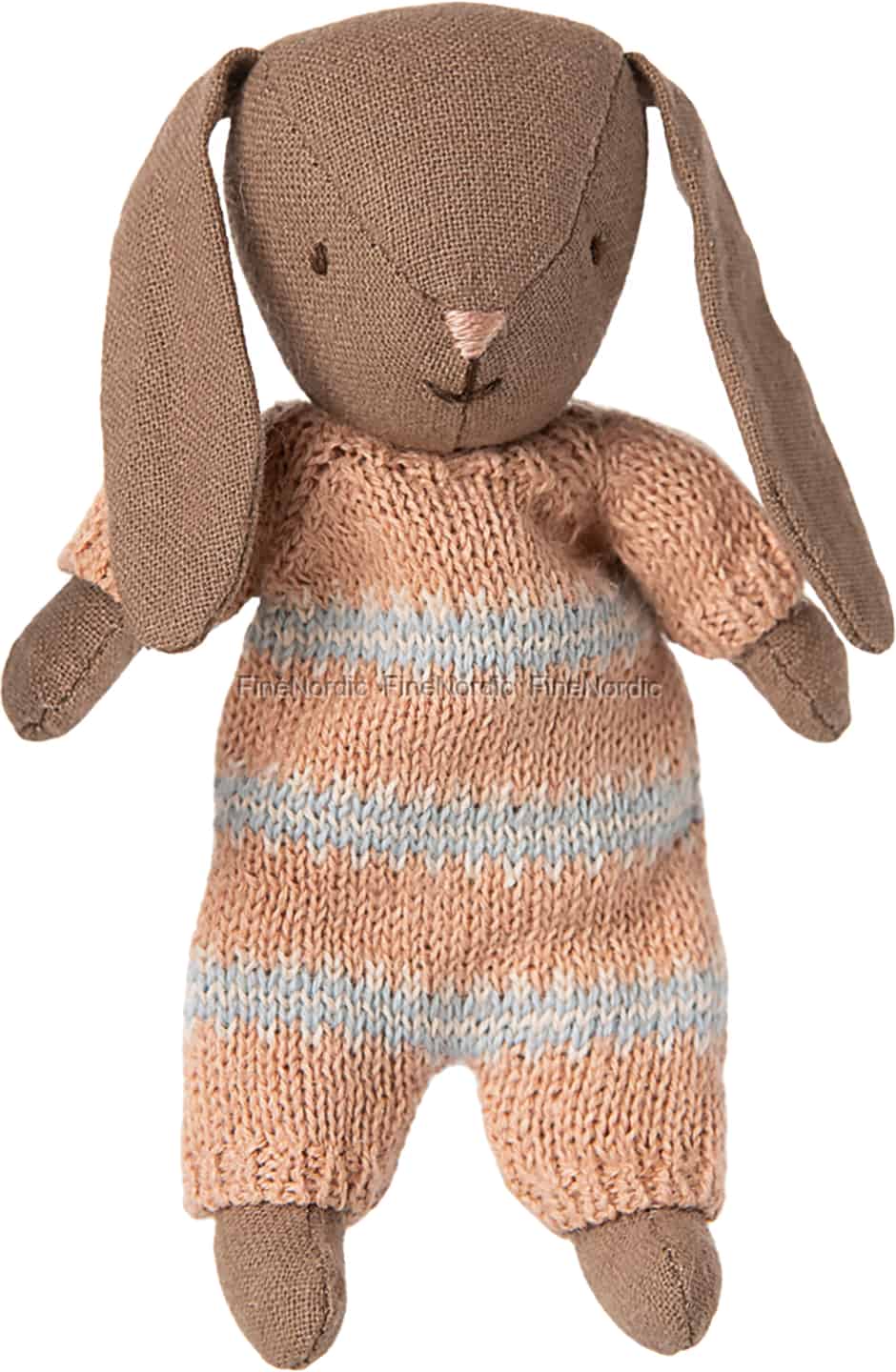 Maileg Kanin Micro - Brun - Støvet Rosa Strikdragt - med Magnetiske Hænder