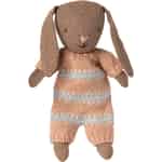 I Mailegs magiske verden har selv de mindste venner de største hjerter. Denne søde, brune kanin, klædt i en blød, stribet dragt i støvet rosa og lyseblå, er klar til at blive en elsket figur i dit barns fantasifulde fortællinger. Dens milde udtryk og bløde ører indbyder til stille samtaler og delte hemmeligheder, hvilket gør den til en vidunderlig første ven for små historiefortællere. Fra morgenknus til eftermiddagseventyr i dukkehuset er denne kanin en konstant og tryg følgesvend.