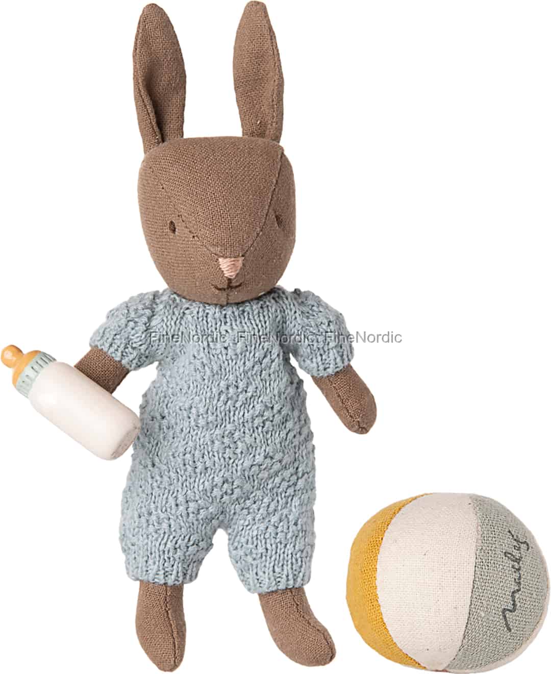 Opdag Mailegs fortryllende verden med dette smukke babykaninsæt. Klædt i den blødeste himmelblå strikkede sparkedragt venter denne lille ven på, at nogen vil elske og passe den. Med små magneter i hænderne kan den holde sin egen sutteflaske ved spisetid eller gøre sig klar til leg med sin farverige, stribede bold. Hver eneste detalje, fra den håndsyede næse til de slaskede hør-ører, er designet til at vække undren og skabe øjeblikke af blid, fantasifuld leg.