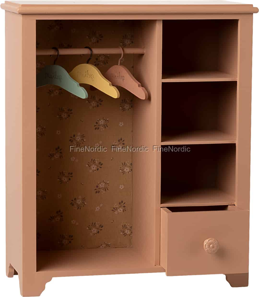 Dette klædeskab er omhyggeligt designet til at være en varig del af dit barns verden. Med en højde på 33 cm har det den perfekte størrelse til at være et centralt møbel på værelset, der tilbyder et særligt sted at passe på ejendelene til deres elskede Maileg-kaniner, -mus og -bamser. Det er mere end bare et stykke legetøj; det er et smukt miniaturemøbel, der opmuntrer til en følelse af ansvar og orden, alt imens det er midtpunktet for utallige fantasifulde eventyr.