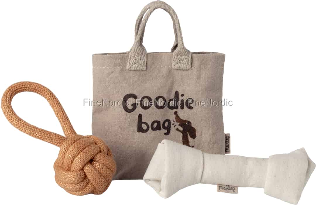 Nu kan dine Maileg-figurer opleve glæden ved at passe deres helt eget kæledyr. Dette bedårende sæt puster liv i den fortælling med charmerende tilbehør i perfekt størrelse. Forestil dig, hvordan de pakker den lille 'Goodie bag' til en tur i parken, klar til en omgang apport med det gyldne reblegetøj. Det bløde, tyggevenlige kødben er den perfekte belønning til en velopdragen hvalp og skaber søde øjeblikke af omsorg og venskab. Det er disse små detaljer, der forvandler legetid til en verden af hjertevarme historier.