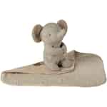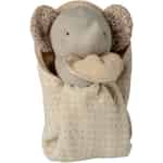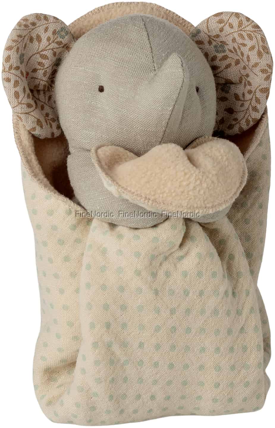 I Mailegs magiske verden har selv de mindste venner de største hjerter. Denne vuggevise-elefant er tænkt som en første fortrolig, en vogter af små hemmeligheder, der hviskes lige før søvnen. Dens bløde, grå tekstilkrop er vidunderligt beroligende at røre ved, mens dens store ører, foret med et fint blomsterprint, altid er klar til at lytte. Puttesvøbt i sin egen hyggelige, polkaprikkede tæppepose giver den en vidunderlig følelse af tryghed og selskab for din baby.