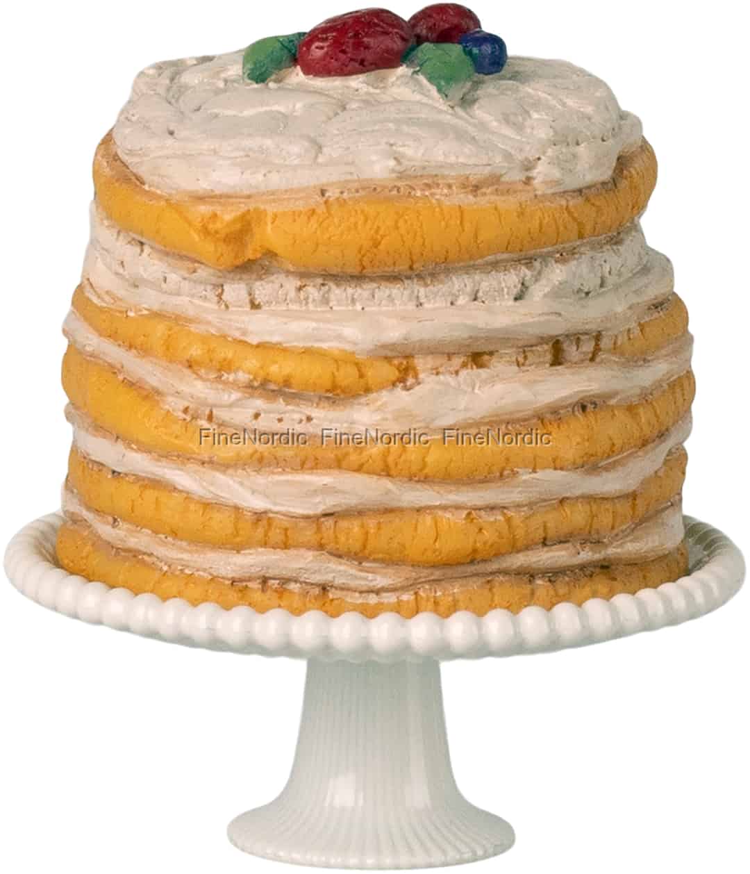 Ethvert særligt øjeblik fortjener en fejring, uanset hvor lille det er. Denne yndige miniature-festkage fra Maileg bringer netop den følelse af festlighed til din elskede samling. Lagene af gyldne lagkagebunde og den fine, råhvide glasur har et vidunderligt rustikt og hjemmelavet præg, kronet med søde små bær. Den troner stolt på et klassisk råhvidt kagefad med perlekant og en riflet fod, klar til at blive højdepunktet ved enhver sammenkomst i musestørrelse – fra fødselsdage til eftermiddagste.