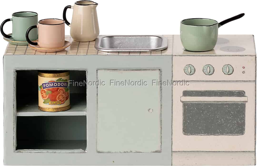 Dette køkken er ikke bare et stykke legetøj; det er en invitation til en verden af fantasi. Det leveres komplet med et dejligt sæt tilbehør, herunder krus, tallerkener og en kande, klar til en hyggelig morgenmad eller en snak over en kop te. Designet til at passe perfekt ind i Maileg musehuset hjælper det dig med at bygge et komplet og fortryllende hjem til dine små venner, hvor hver dag er fyldt med de enkle glæder ved et miniature-hverdagsliv.