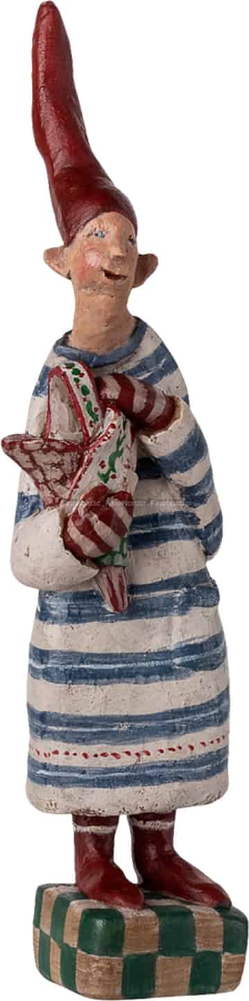 Årets karakter, nr. 36, er ingen undtagelse. Med røde kinder og et glimt i øjet står han stolt på sin ternede klods, klædt i sin yndlingsblå- og hvidstribede tunika. Han holder en lille sæk, hvorfra en smukt dekoreret julesok titter frem og antyder de små glæder og overraskelser, han har samlet til husstanden. Hans høje røde hue, et kendetegn for hans slægt, vipper blidt, mens han våger over hjemmet og sikrer, at alt er roligt og lyst.