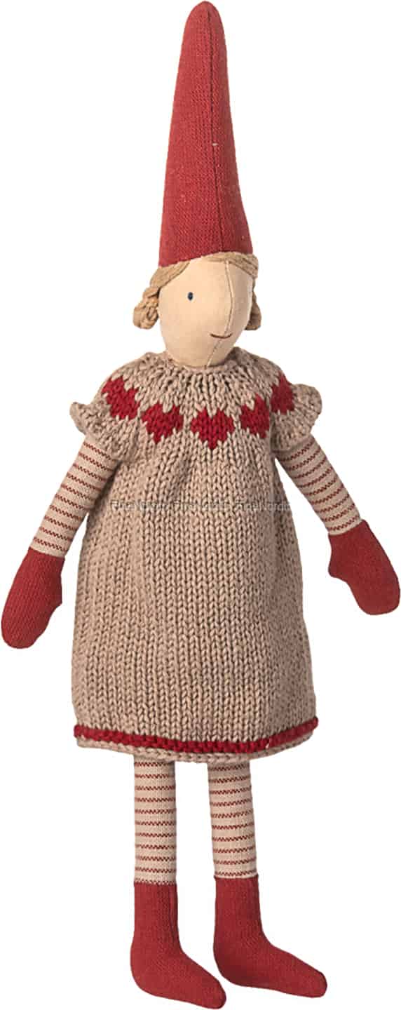 Forestil dig den stille forventning julemorgen, indfanget i denne fortryllende Maileg nisse. Klædt i sin hyggeligste strikkede kjole er hun klar til at tage del i familiens juletraditioner og våge over højtides blide stunder.