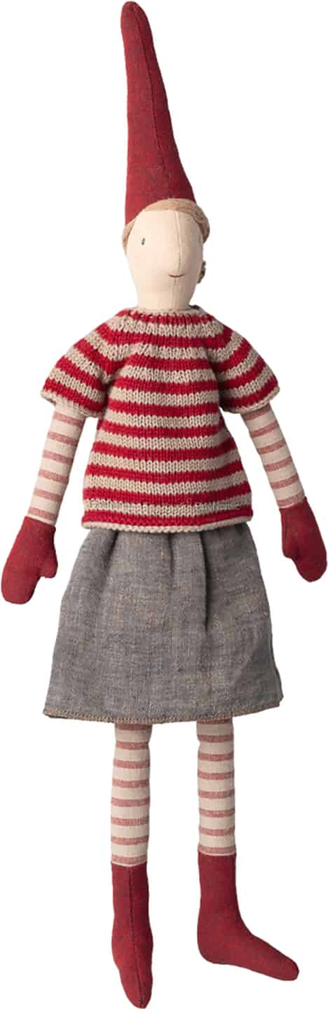 Hun er klædt på til en kølig nordisk vinterdag, og hendes tøj er en fryd af teksturer. Læg mærke til den kraftige strik i hendes stribede trøje, den bløde filt i hendes karakteristiske røde nissehue og vanter, og den fine vævning i hendes grå nederdel. Hver en detalje, fra hendes stribede strømper til hendes små røde støvler, er gennemtænkt designet til at vække fantasien. Hun er en karakter, der venter på at blive vævet ind i jeres families juleminder.