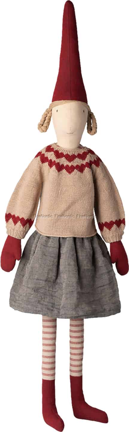 Når juletiden nærmer sig, kan du forestille dig et stille hjørne af dit hjem, der vækkes til live med en blid charme. Denne yndige Maileg nissepige, med sit venlige smil og hyggelige vintertøj, er klar til at blive en del af din families julefortælling.