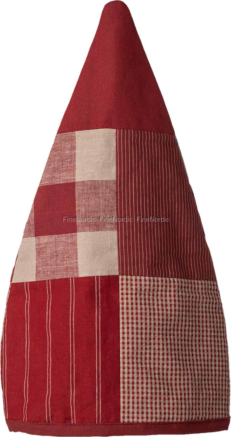 - Et samspil af festlige mønstre: Huen er skabt af en dejlig mosaik af tern, striber og ensfarvede stoffer i varme julefarver, hvilket giver den et vidunderligt nostalgisk og håndlavet udtryk, der sætter gang i fantasien.